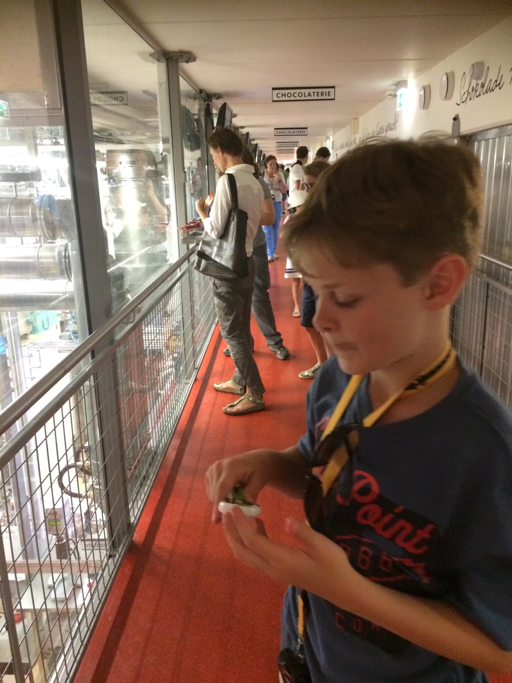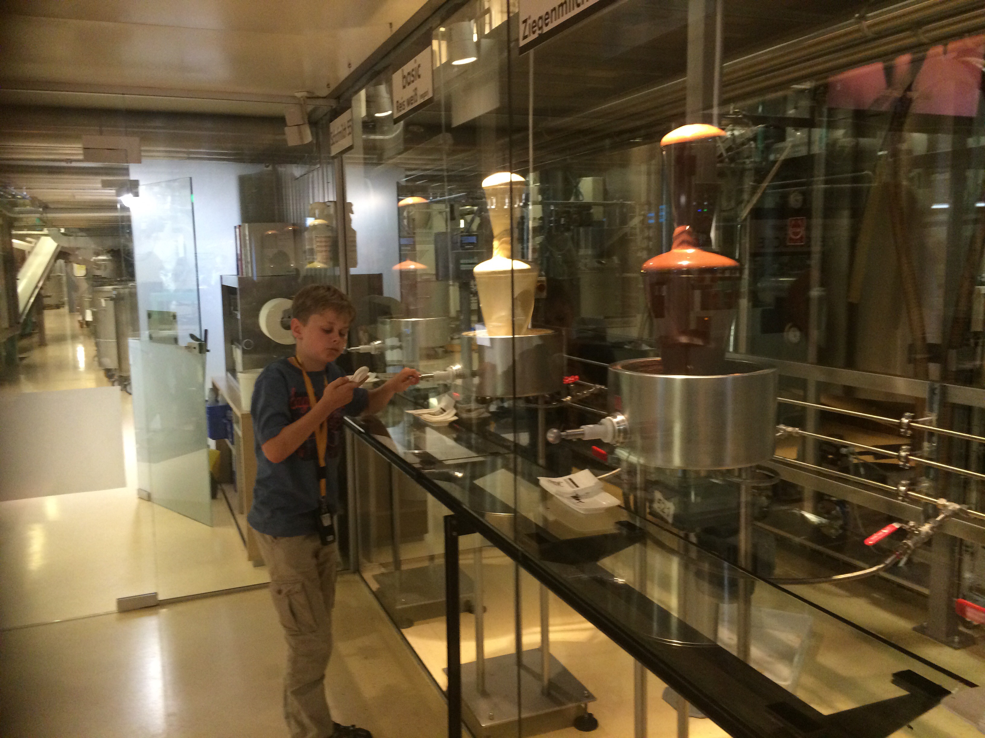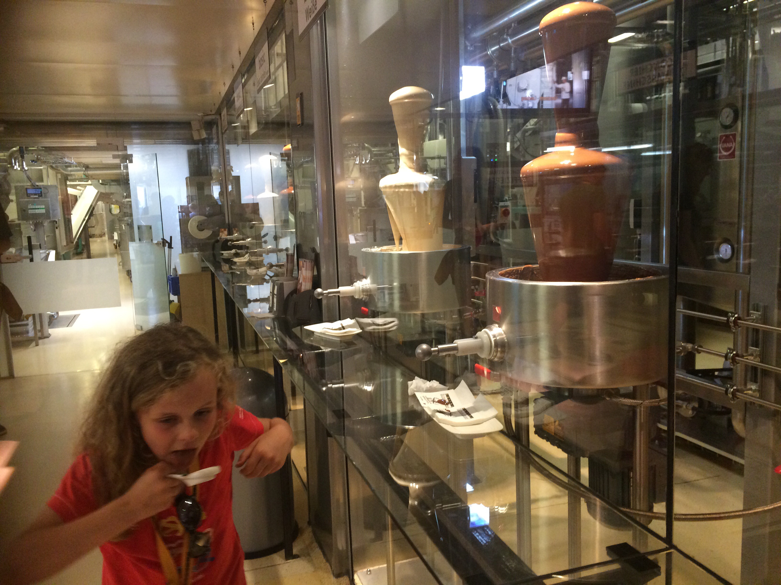 Eventually our timed slot for the chocolate factory arrived! We were very excited, we started by watching a film and then progressed to the factory. We were given audio guides which were forgotten about by the time we climbed the stairs to the observation platform. Along every wall was a tasting area. We were given China spoons like the soup spoons you use in a Chinese restaurant to use.