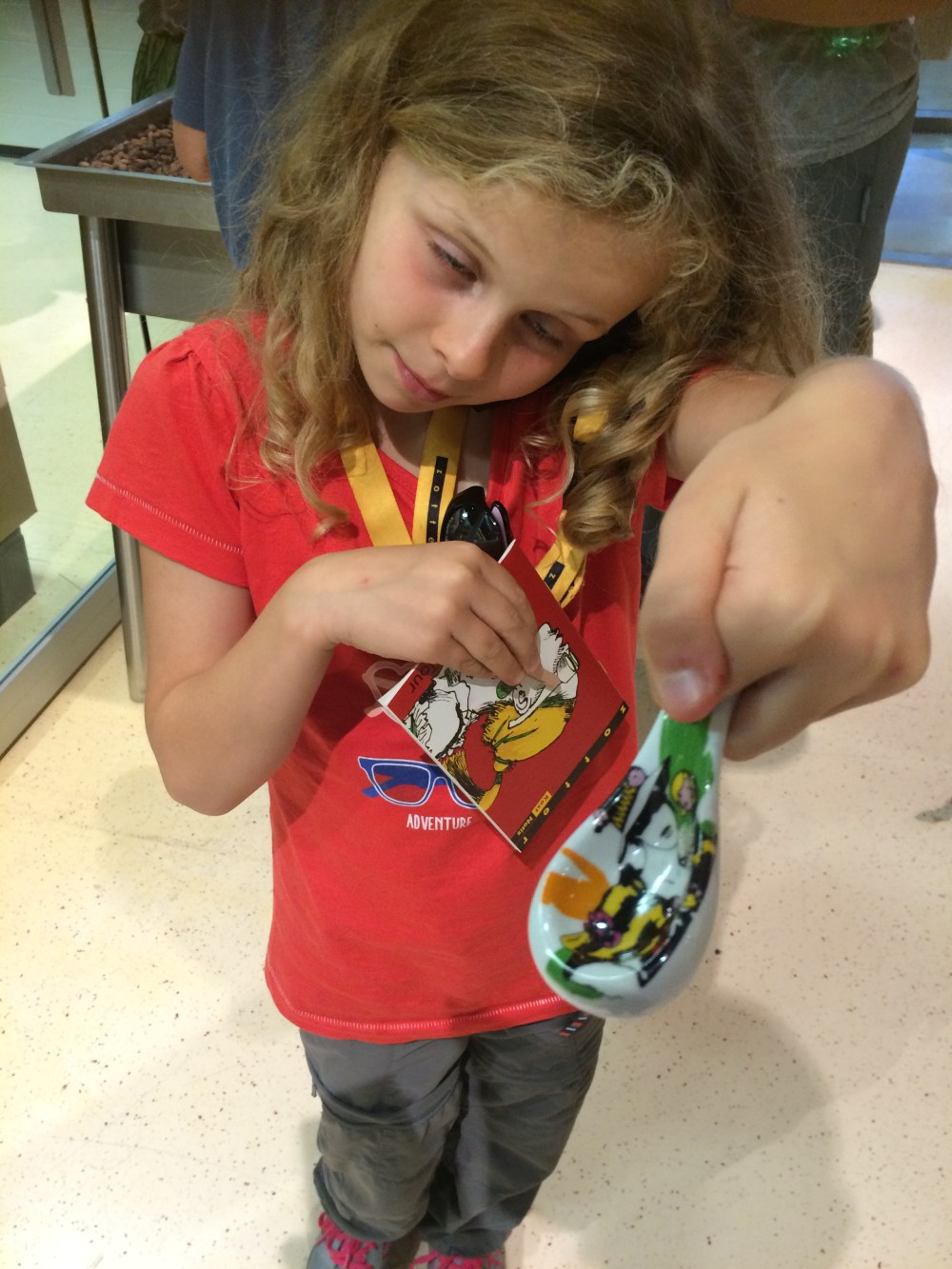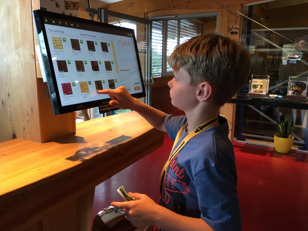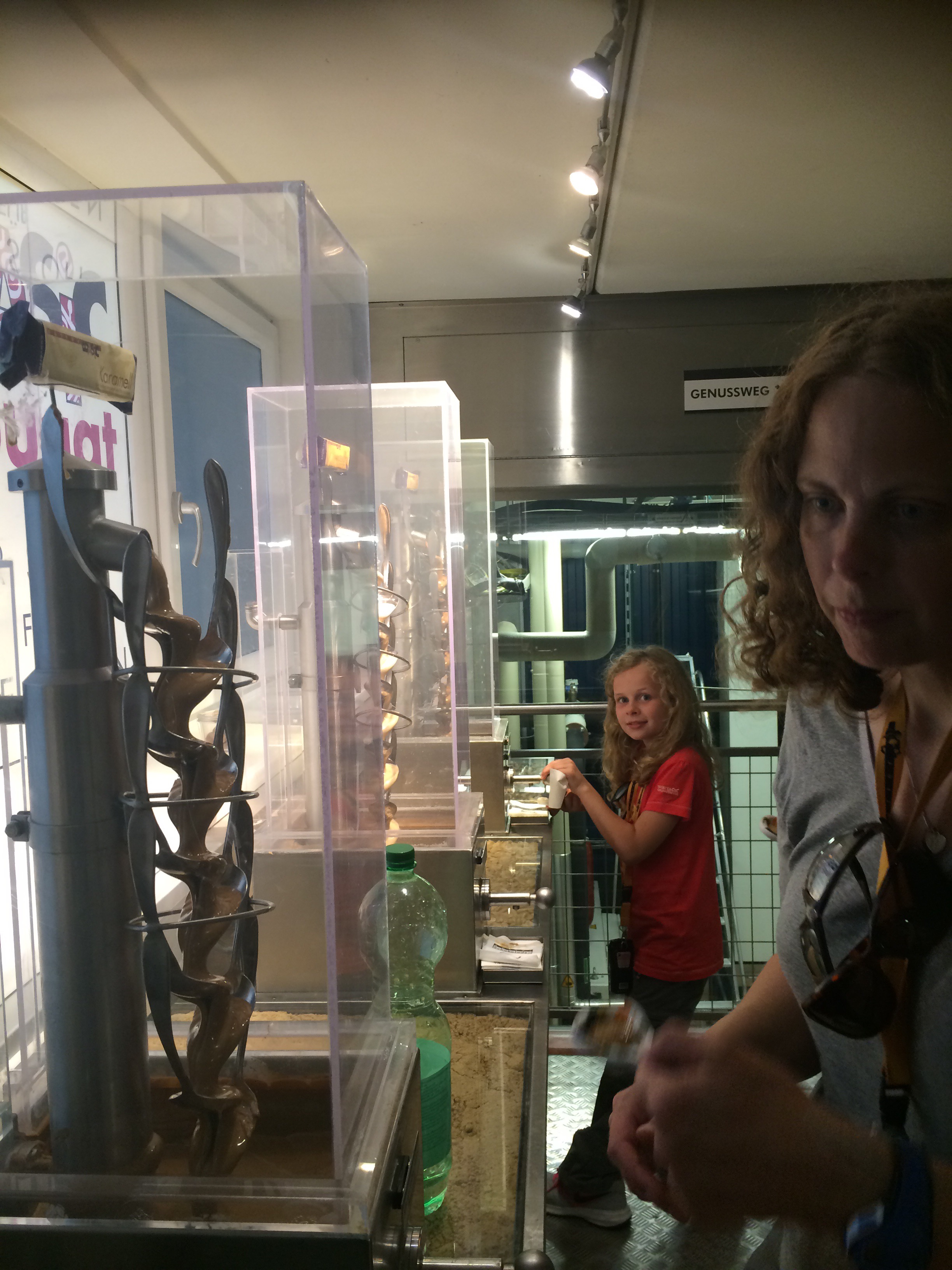 Eventually our timed slot for the chocolate factory arrived! We were very excited, we started by watching a film and then progressed to the factory. We were given audio guides which were forgotten about by the time we climbed the stairs to the observation platform. Along every wall was a tasting area. We were given China spoons like the soup spoons you use in a Chinese restaurant to use.